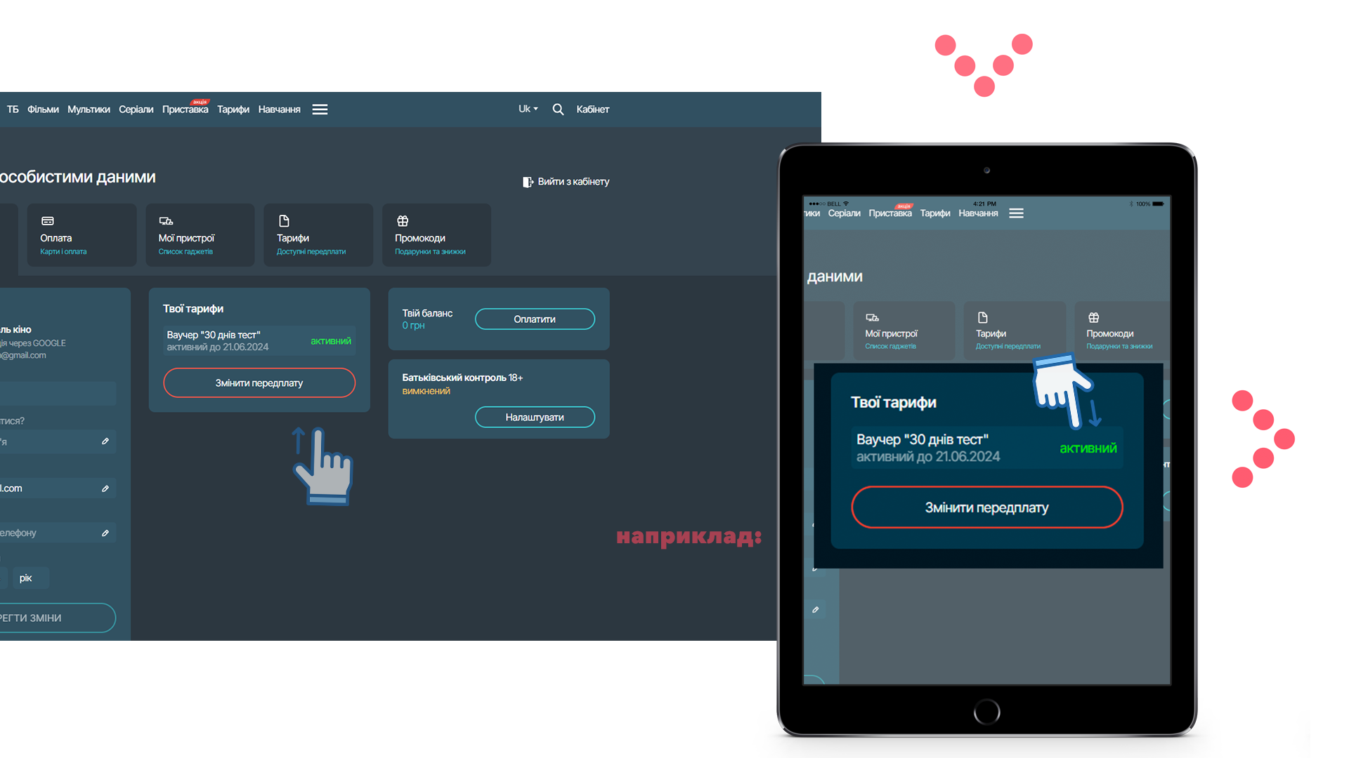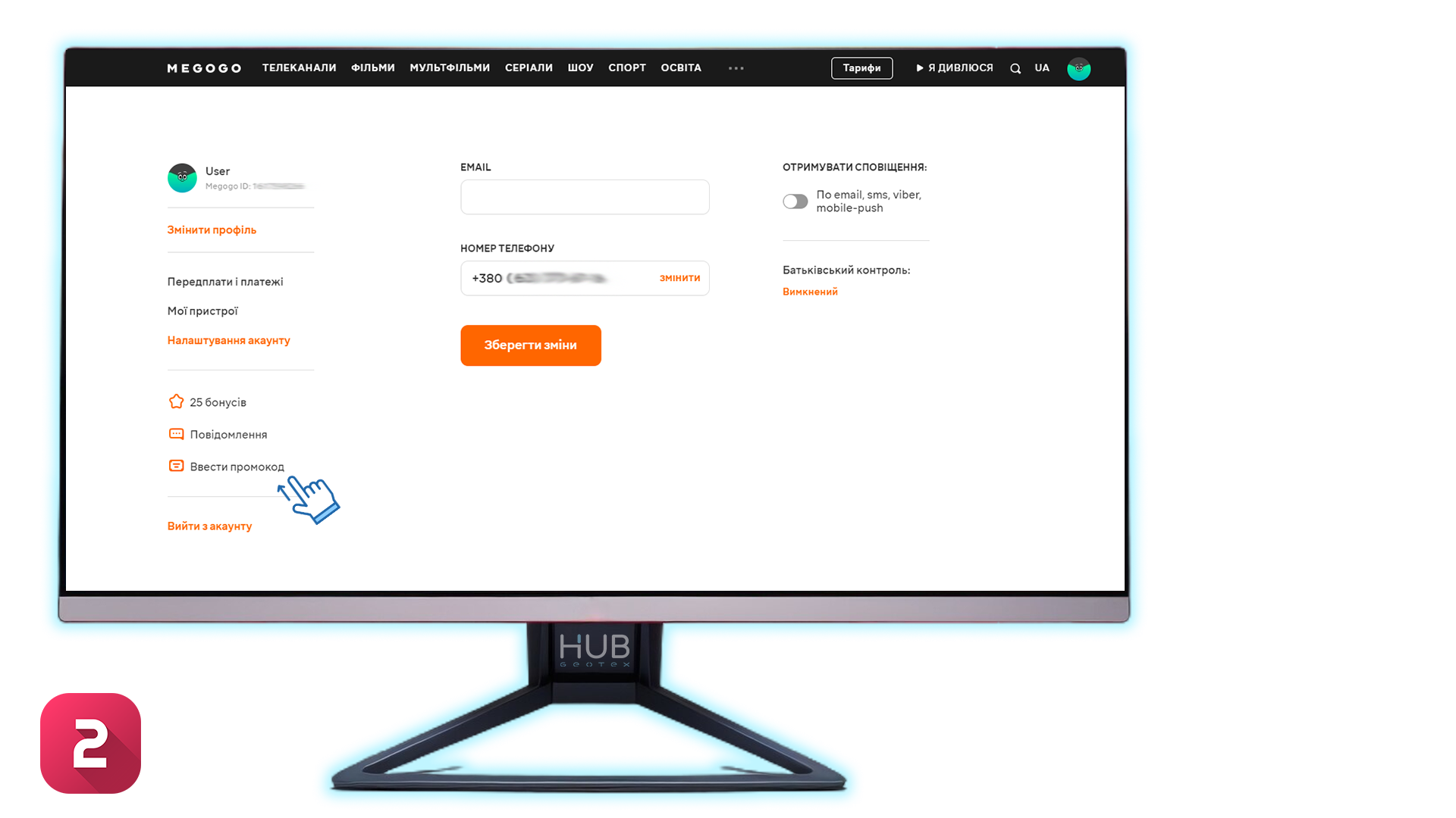Після успішного входу/реєстрації перейдіть до свого кабінету та оберіть налаштування акаунту. Там вам буде доступний розділ "ввести промокод". Введіть код, активуйте - насолоджуйтесь переглядом.