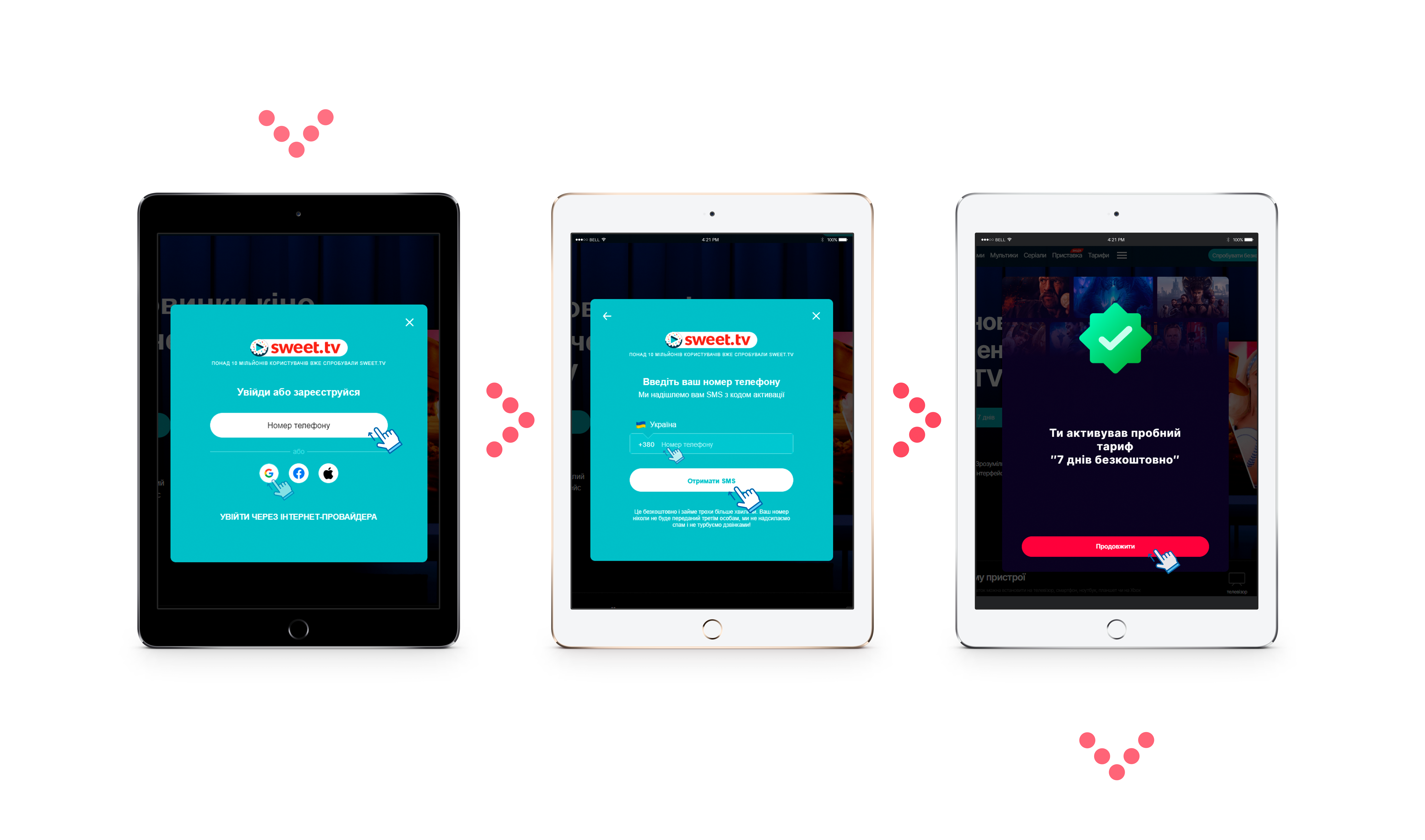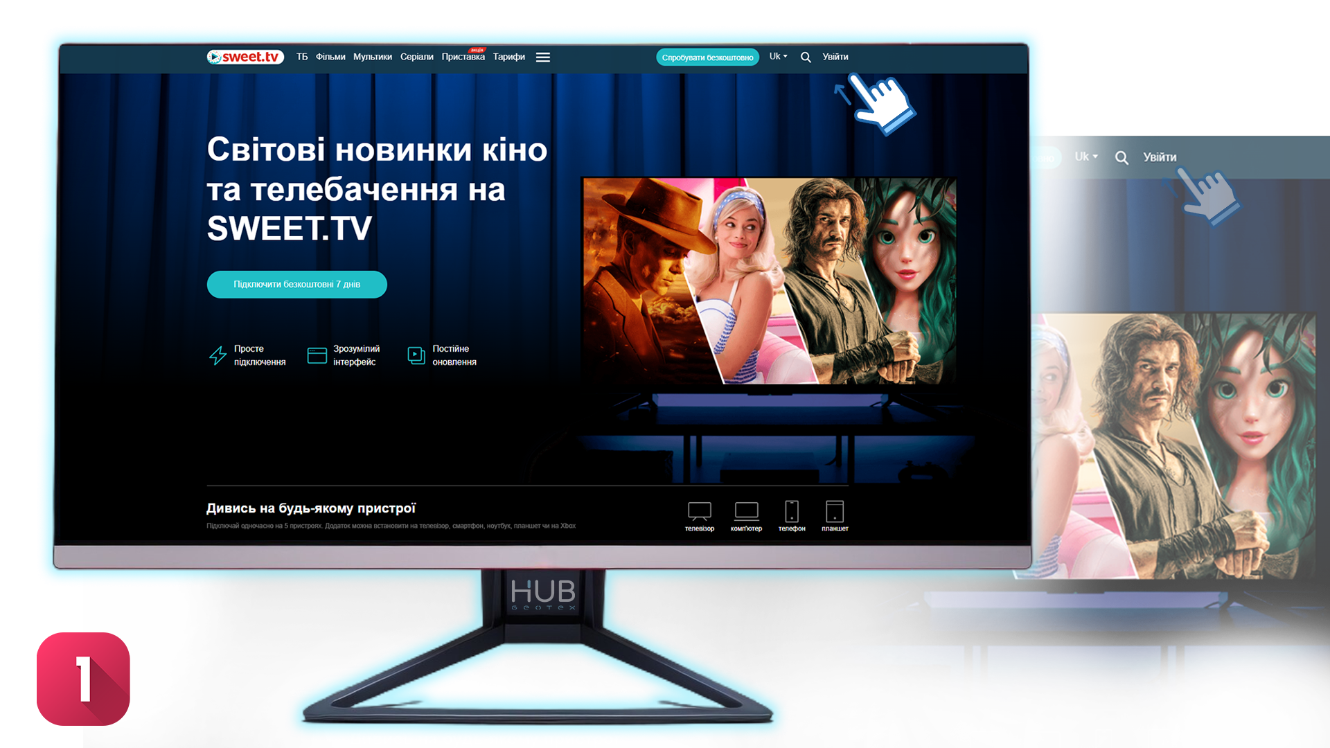 Відкрийте додаток Sweet.tv на своєму пристрої або перейдіть на сайт національного онлайн-кінотеатру. Увійдіть до свого існуючого кабінету або зареєструйтеся, якщо у вас ще немає дійсного аккаунта.