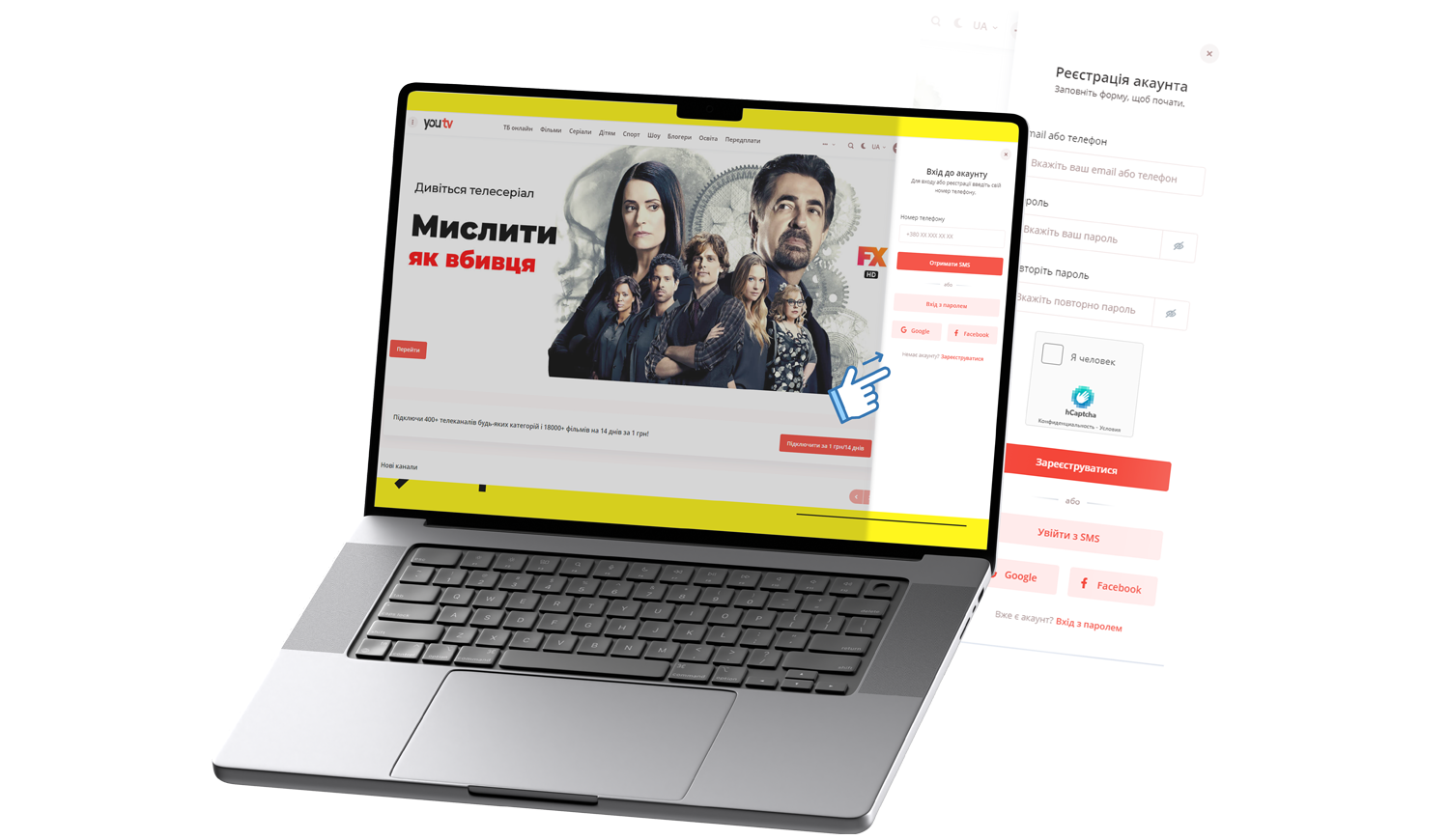 Ввести та активувати промокод можна, як у додатку, так і на сайті YouTV. Увійдіть до свого існуючого кабінету або зареєструйтеся, якщо у вас ще немає дійсного аккаунта.