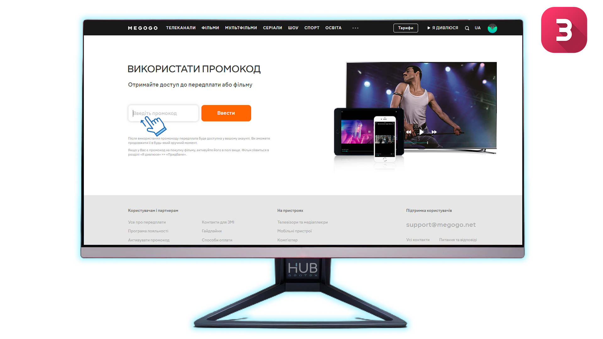 Після успішного входу/реєстрації перейдіть до свого кабінету та оберіть налаштування акаунту. Там вам буде доступний розділ "ввести промокод". Введіть код, активуйте - насолоджуйтесь переглядом.