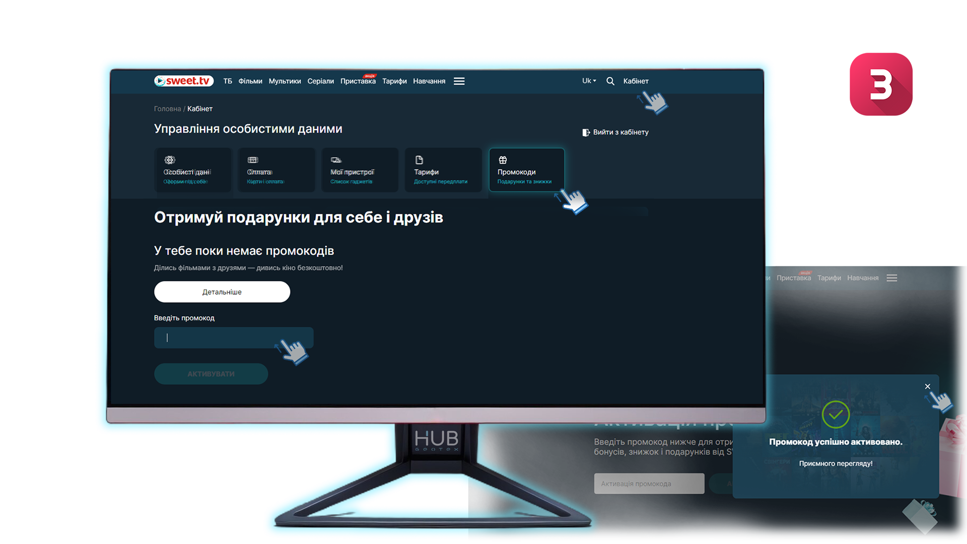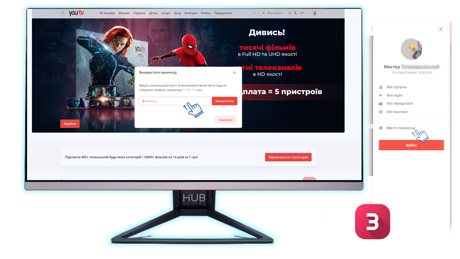 Після успішної авторизації/реєстрації, відкрийте меню свого кабінету, та оберіть "ввести промокод". Введіть промокод та насолоджуйтесь переглядом.